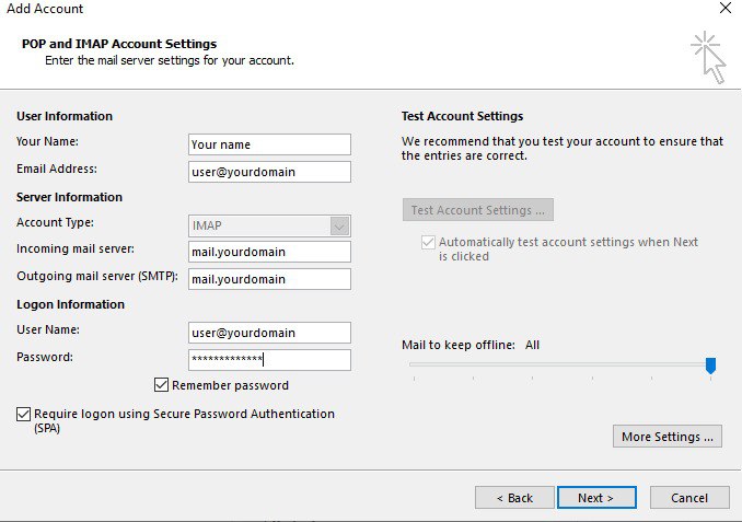 2. Preencha todos os campos com os dados que o cPanel forneceu-lhe